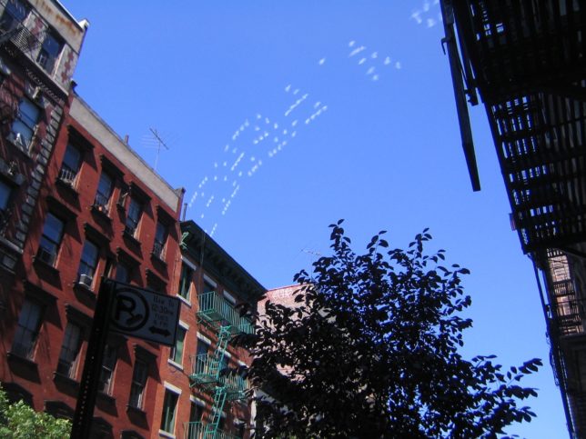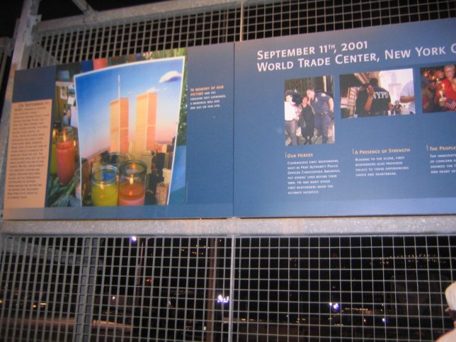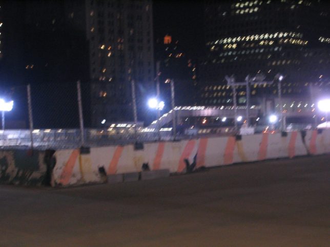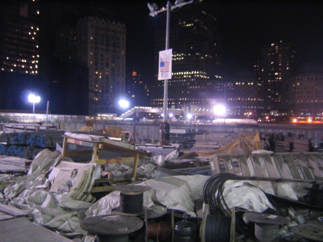 見にくいけどグラウンド・ゼロから光が2本直立してた。今では日本でもよくあるけど、当時はちょっとびっくりした。すごい力強い光。