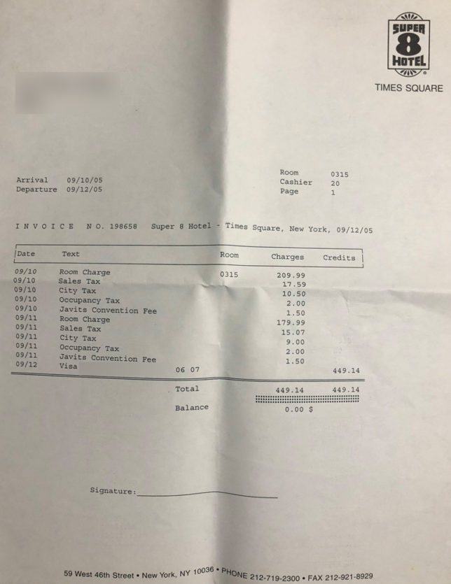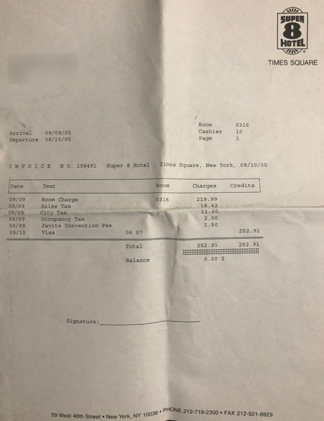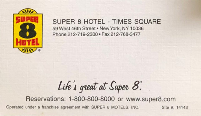 右も左もわからない、ニューヨークのどの辺にいるかも全くわからん安そうなホテルの前に付けられて、20ドル札を3枚渡した。(実際は55ドル)