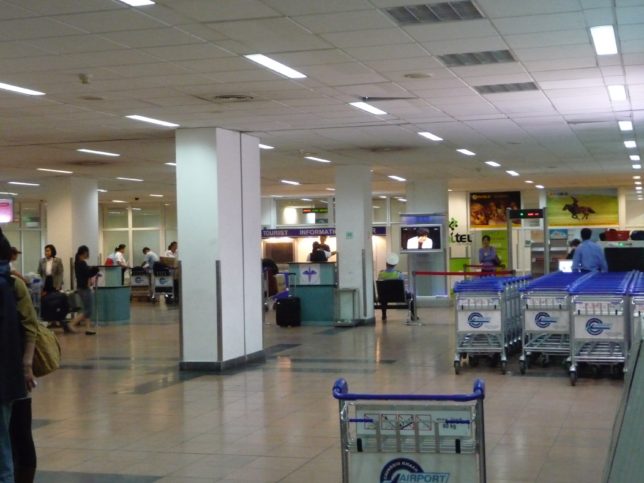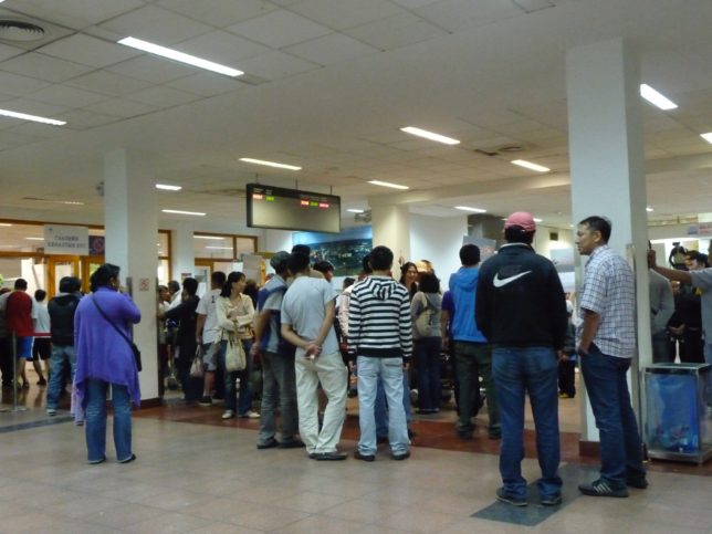 第2ターミナルでケータイ(海外用と思われる)を借りて、第1ターミナルに戻って搭乗手続き。確認もしないでケータイ予約するからこんなややこしいことになった。らしい。