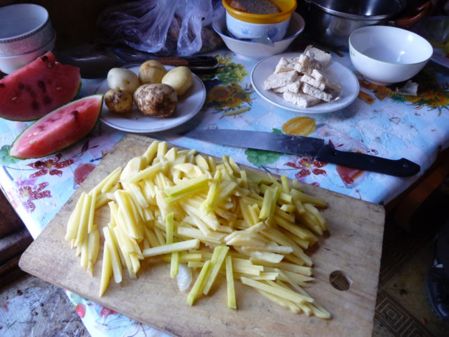 ジャガイモ、にんじん(細かった)、玉ねぎ(小さかった)をそれぞれ小さく包丁でカットした。ナナさんもやって上手かった。