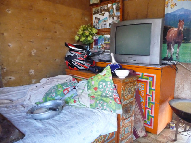 あと小麦粉で麺を作る。でもできない?クッキーも作るってなってたけど爆乳ねーさん「Oh my God」言ってて、なくなった?どうなったかわからん。あとはうちらがやるから隣のゲルにでも行っておいでと言われて、いやこれから味付けとかむしろそこを見たいんだがと思いながら隣のゲル行ったら爆乳ねーさんのダンナさんがテレビ(モンゴルのお笑い)見てた。それからテレビでトランスフォーマー見せられたけど、まじこんなとこ来てすることじゃないので、外に出てそこらへんの子どもたちと遊ぶことにした。