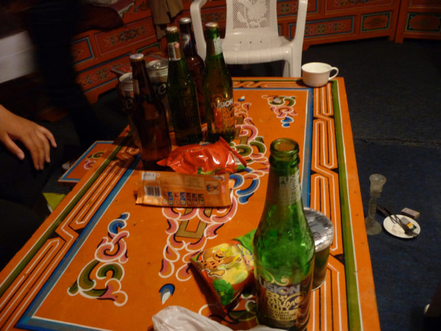 ゲルに帰って、シャワーを浴びてからガイドさん達が泊まるテントに呼ばれた。親子3人(日本人やったと思う)とガイド2人?でしばらく喋るけど、日本人のおばちゃんのお化粧講座とか始まってちょっとおもんなかったから、ガイドと子どものはじめ君と石ゲーム(モンゴルの遊び)した。1人5個ずつ石を持って、右手と左手に隠して腰に回して数を当てる。当たったらそれをもらえる。まあまあ面白かった記憶やけど、だんだんみんなテンション下がってきてそろそろ戻るかーってなった時に、ナナさんが僕だけ呼び止めて「一緒に飲みませんか」って腕握られた。ナナサーーーーン