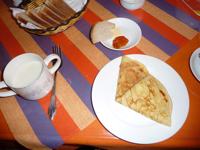 9時10分前くらいに無理やり起きて朝食へ。朝5時くらいにナナさんが入ってきて薪焚いてくれてたから起きた時あったかかった。これは泊まってる間毎日やってくれた。